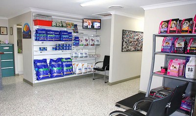 The waiting room is a spacious area with comfortable leather chairs, and a large variety of pet care items and food. There are also weighing scales and a television.